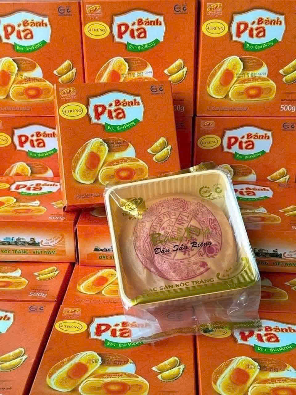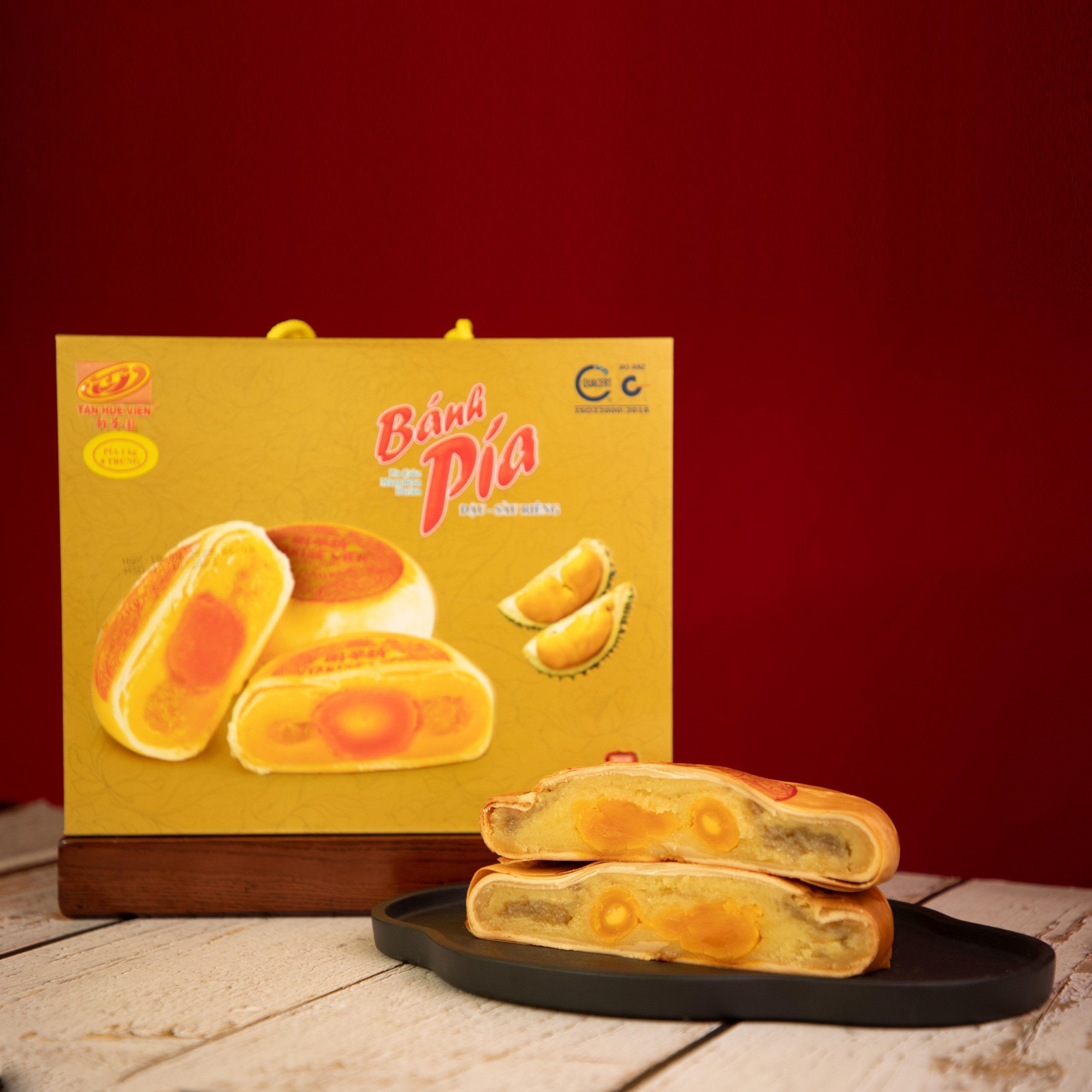 Bánh pía 500g 4 trứng là sản phẩm đặc biệt của Tân Huê Viên chỉ ra mắt vào các dịp Trung Thu hay Tết Nguyên Đán. Bánh có thành phần chính là đậu xanh, sầu riêng và lòng đỏ trứng vịt muối cùng nhiều nguyên liệu khác kết hợp tạo nên hương vị đặc trưng của bánh Pía Sóc Trăng.