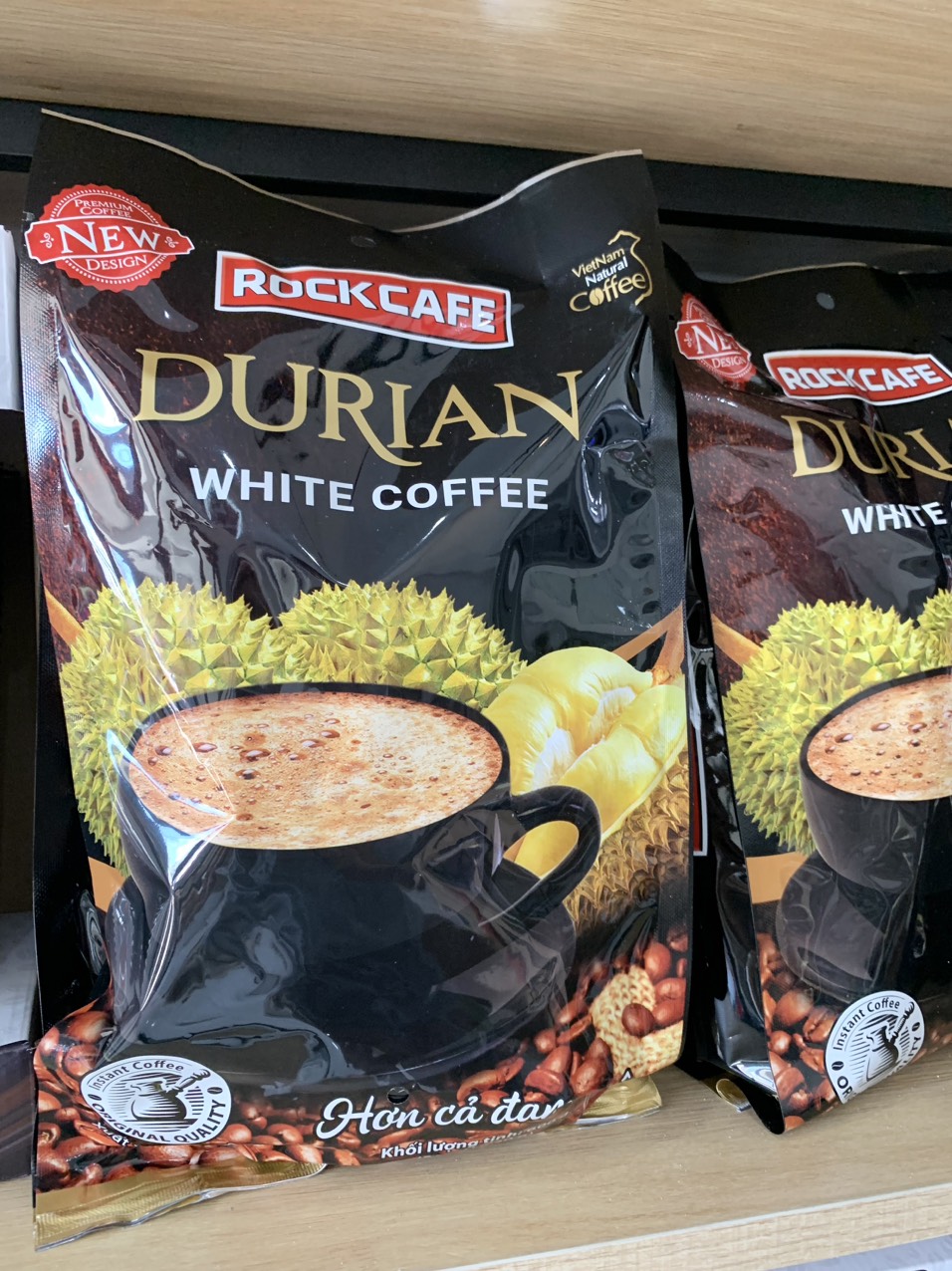 THÀNH PHẦN: Bột kem không sữa (Glucose syrup, Dầu thực vật, Chất ổn định (340(ii), 451(1), Protein ‘ sửa Chất nhũ hóa (471, 481(i)), Chất chống đông vón (551)), Đường, Cà phê hòa tan (8 %), Bột sữa dừa (Nước cốt dừa, Mạch nha (Glucose syrup/High mailtose syrup), Bột protein (Sodium caseinate)], Bột kem tạo bọt (Si rô glucoza khô, Chất béo thực vật, Sữa khô, Chất ổn định (340(ii)), Chất nhũ hóa (481(i)), Hương sữa tự nhiên và tổng hợp), Bột sầu riêng 4 %), Maltodextrin, Bột ca cao, Muối, Hương liệu tổng hợp (hương sầu riêng).