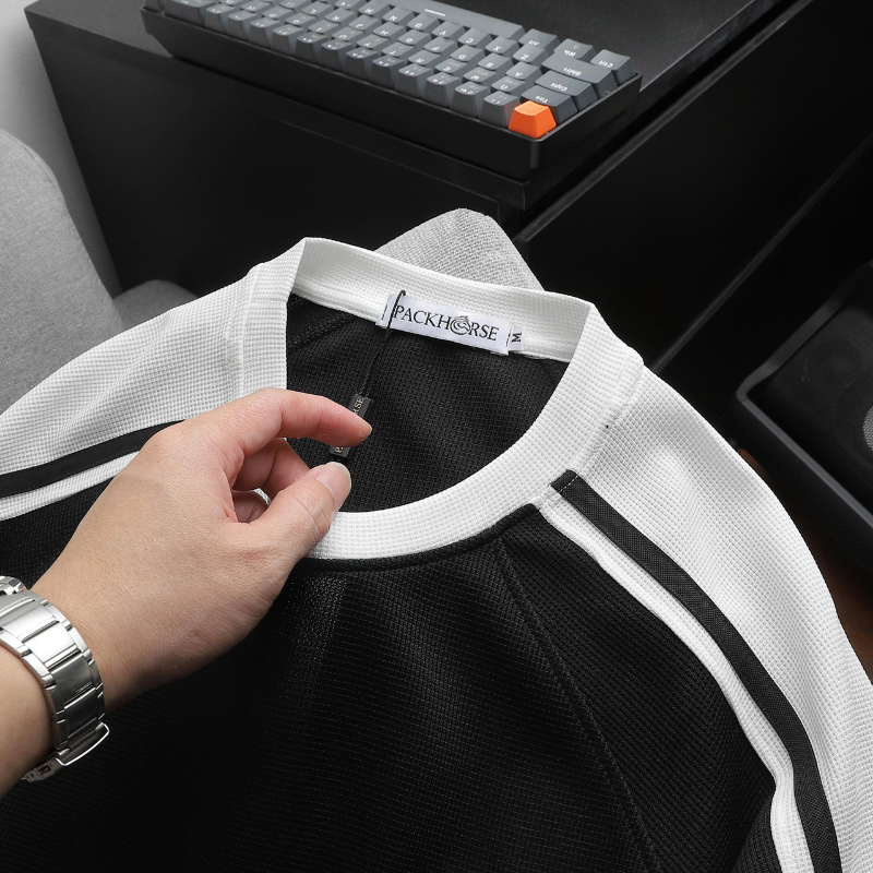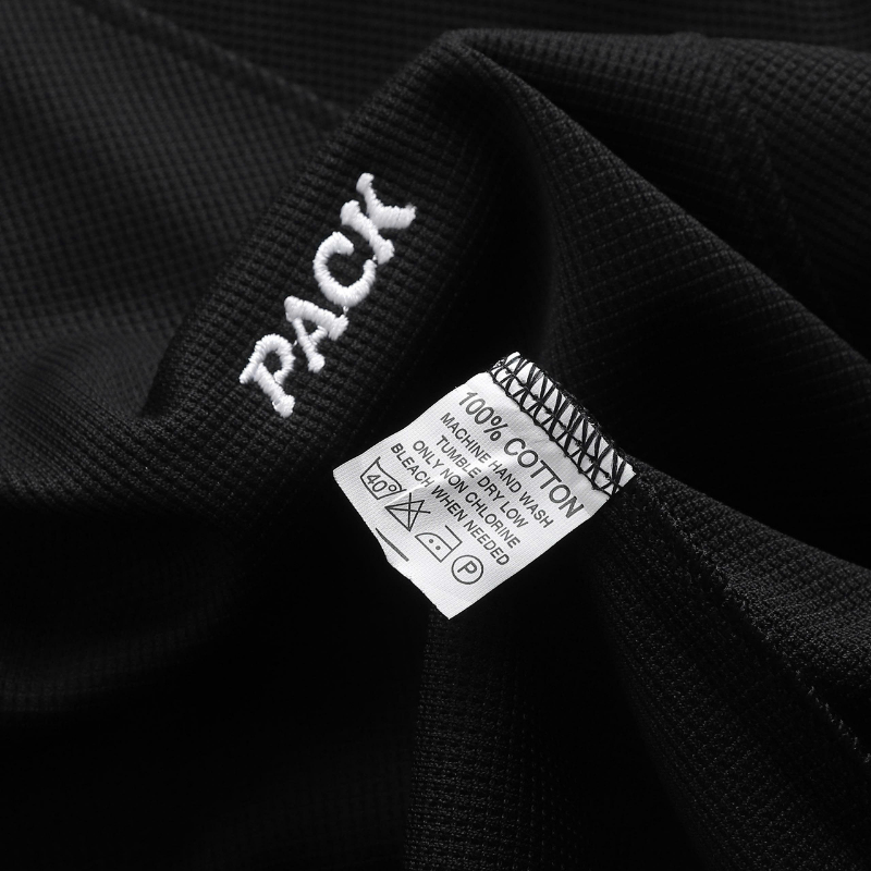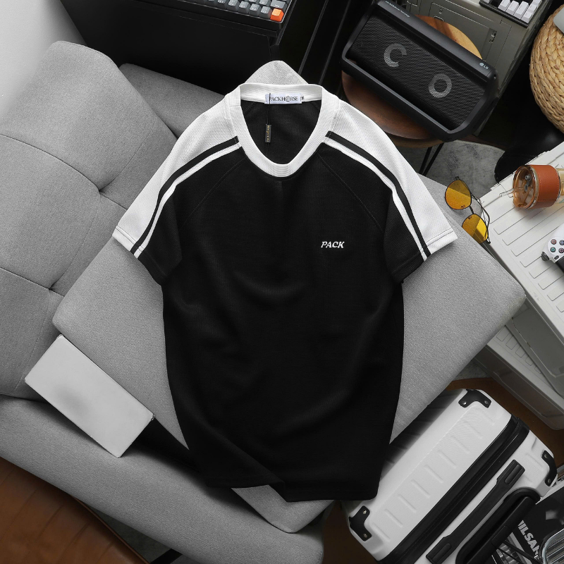 - Áo: Cổ tròn, phối sọc vai hai bên, logo PACK thêu tinh tế trước ngực.