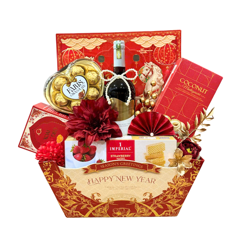 🎁 Bên trong gồm đủ bánh – socola – vang – trái cây sấy, toàn sản phẩm dễ dùng, giá trị thiết thực, lên form giỏ nhìn sang mà không bị rối.