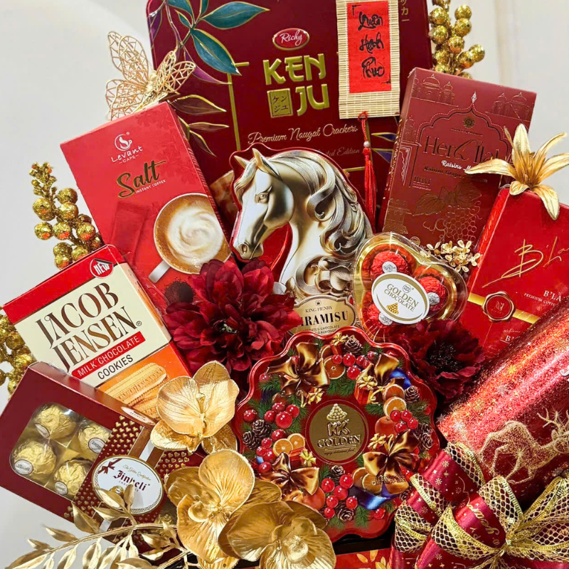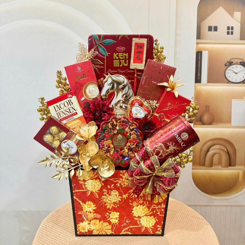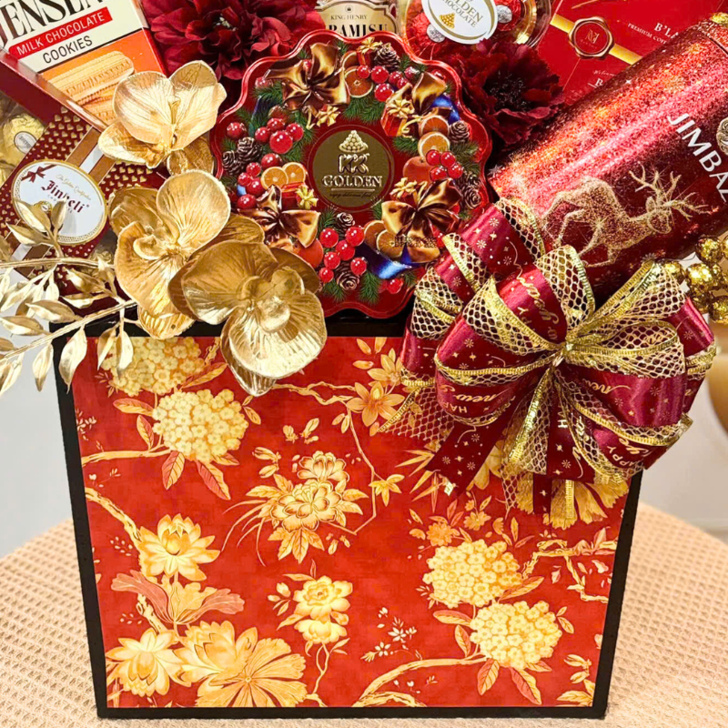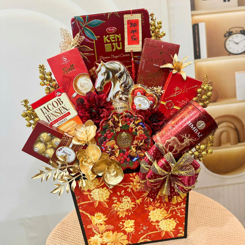 - Tông đỏ – vàng sang chảnh → đúng vibe quà Tết đẳng cấp