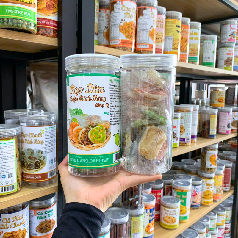 Kẹo Dừa Nướng – Kẹo Dừa Cuộn Bánh Phồng Mix 7 Vị Thơm Ngon 300g Hộp Pet