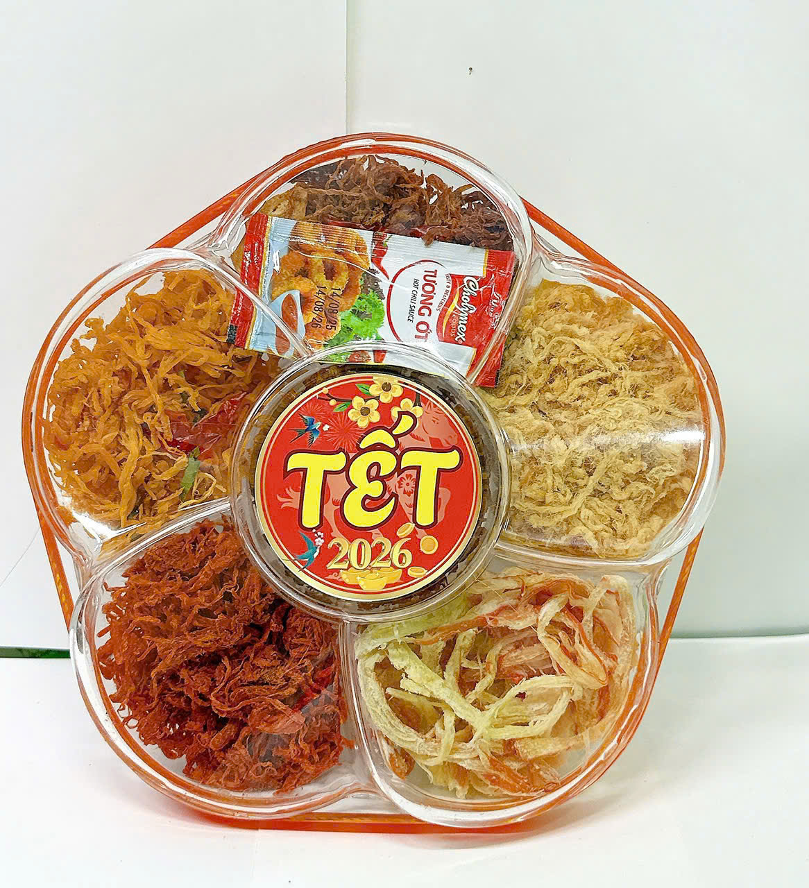 THÀNH PHẦN: Mực Xé Tẩm Vị, Mực Ông Xé Sợi, Khô Gà Lá Chanh, Khô Tẩm Vị Heo, Khô Tẩm Vị Bò, Chà Bông