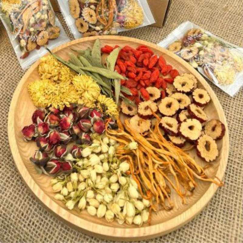 THÀNH PHẦN: Gạo lứt huyết rồng, đậu đen xanh lòng vỡ hạt, đậu đỏ vỡ hạt, nụ hoa hồng, nụ hoa nhài, kỷ tử, táo lát, cỏ ngọt, đông trùng hạ thảo.