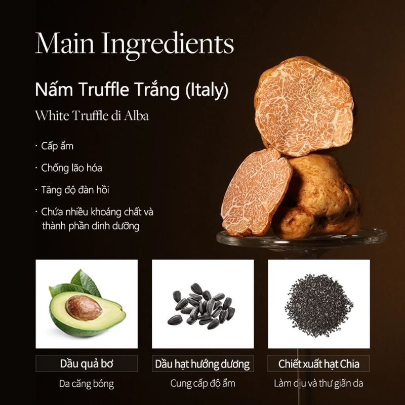 THÀNH PHẦN: Water, dipropylene glycol, neopentyl glycol diheptanoate, glycereth-26, 1,2-hexanediol, niacinamide, sorbitol, hydroxyethyl urea, persea gratissima (avocado) oil, salvia hispanica seed extract, ocimum basilicum (basil) flower/leaf/stem extract, betaine, avena sativa (oat) kernel extract, butylene glycol, tuber magnatum extract, glycerin, helianthus annuus (sunflower) seed oil, tocopheryl acetate, disodium edta, dipotassium glycyrrhizate, adenosine, sodium palmitoyl proline, bifida ferment lysate, nymphaea alba flower extract, hydrolyzed hyaluronic acid, glycine soja (soybean) oil, saussurea involucrata extract, panax ginseng root extract, nelumbo nucifera flower extract, morus alba bark extract, lilium candidum flower extract, leonto podium alpinum extract, houttuynia cordata extract, freesia refracta extract, carbomer, bellis perennis (daisy) flower extract, arginine, potassium sorbate, bixa orellana seed oil, tocopherol, fragrance, linalool, hexyl cinnamal, limonene, citronellol.