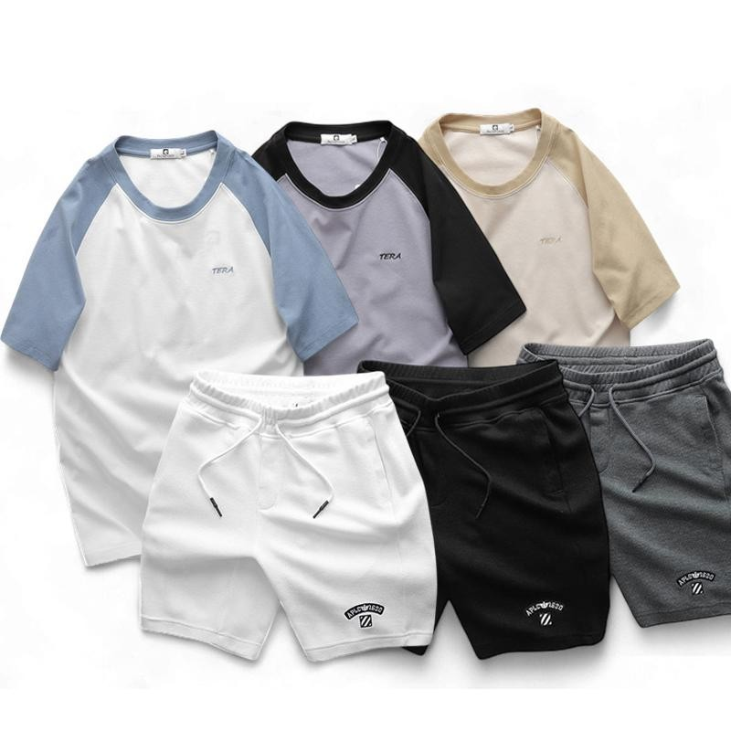 Set Bộ Nam Áo Cổ Tròn Phối Màu Thêu Chữ Trước Ngực & Quần Short Thêu Nổi Logo Chữ Có Big Size