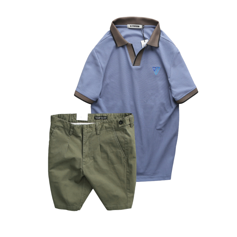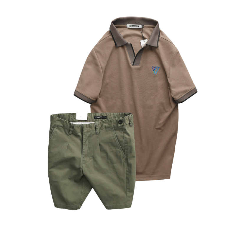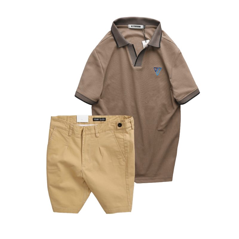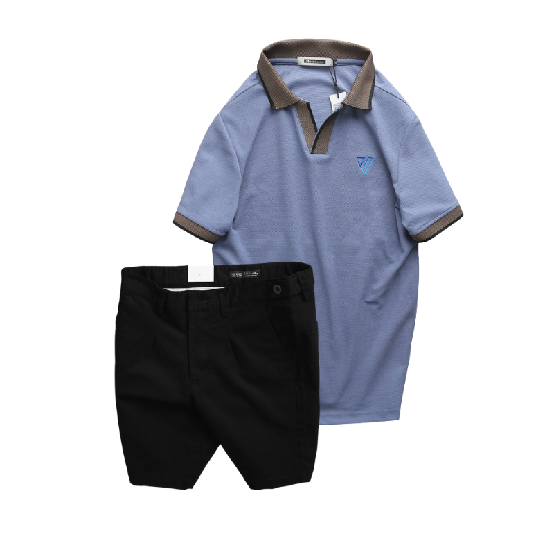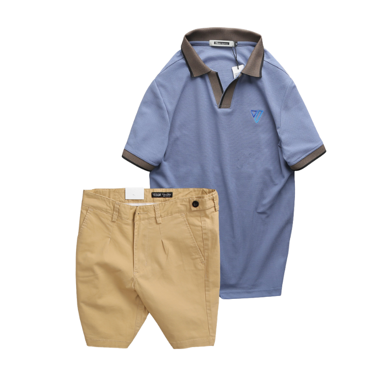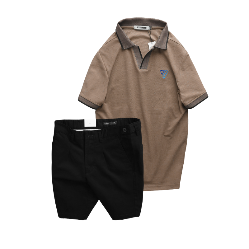 Set Bộ Nam – Áo Thun Nam Polo Cổ Bẻ Thêu Logo Hình Tam Giác Và Quần Short Kaki Co Giãn Phối Nút Cao Cấp (Có Size 36)