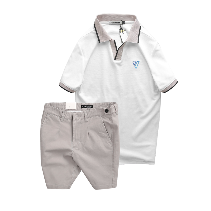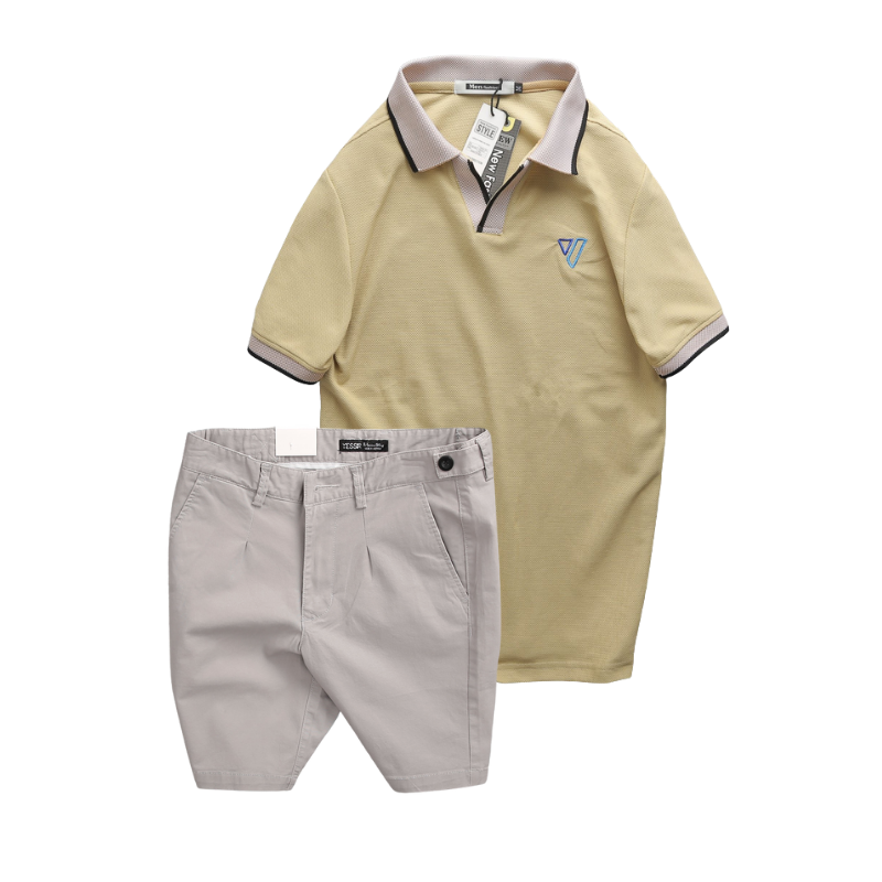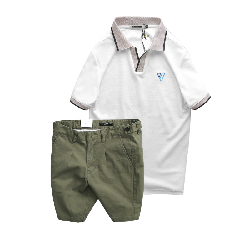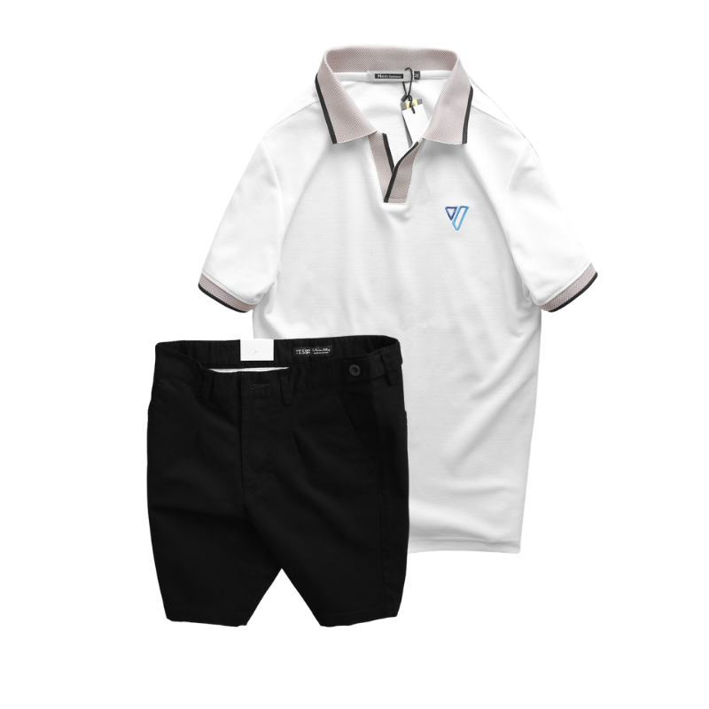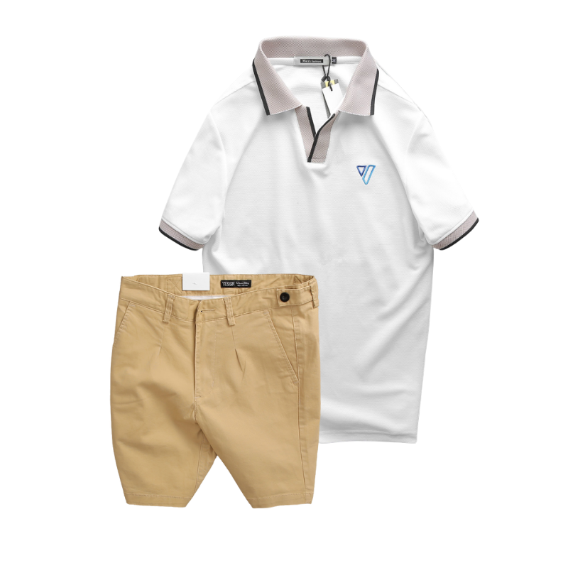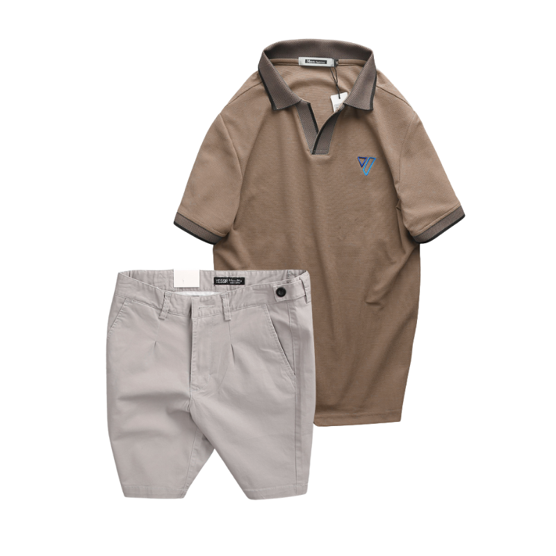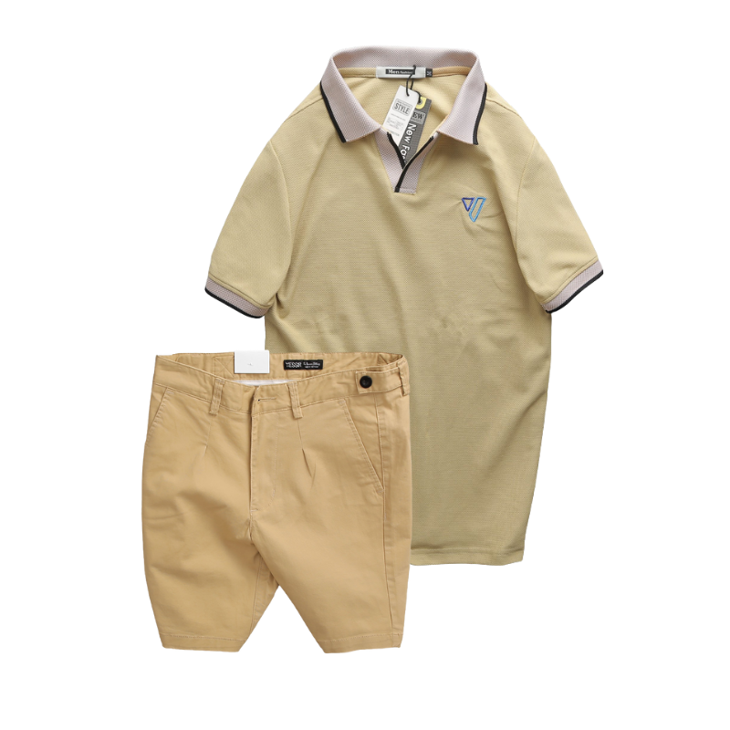 Set Bộ Nam – Áo Thun Nam Polo Cổ Bẻ Thêu Logo Hình Tam Giác Và Quần Short Kaki Co Giãn Phối Nút Cao Cấp (Có Size 36)
