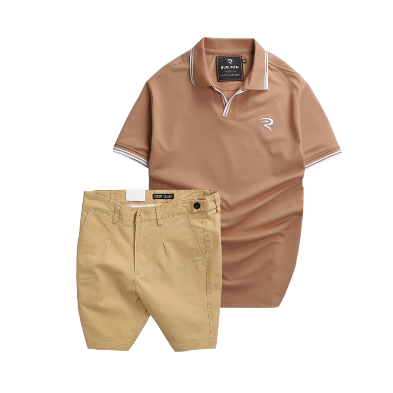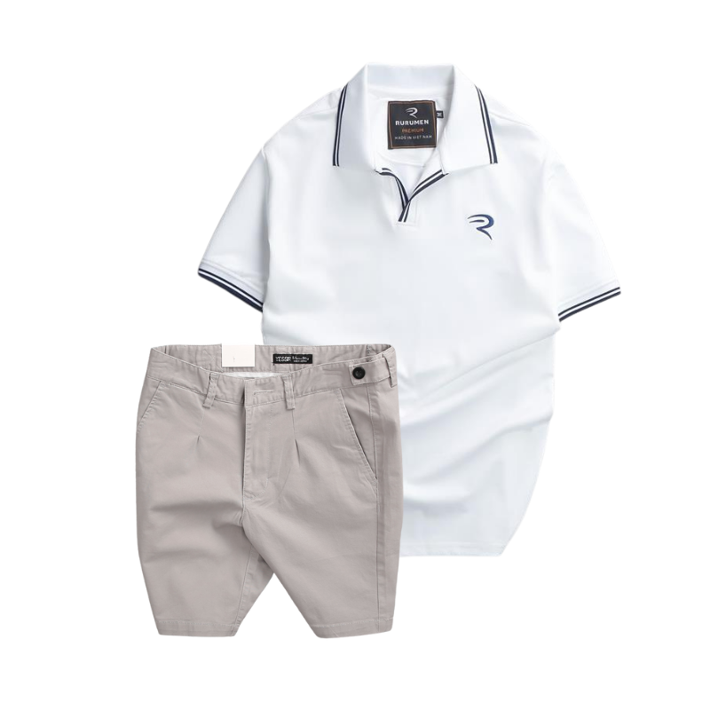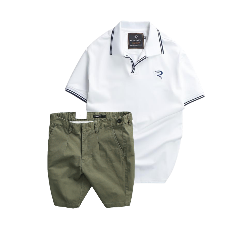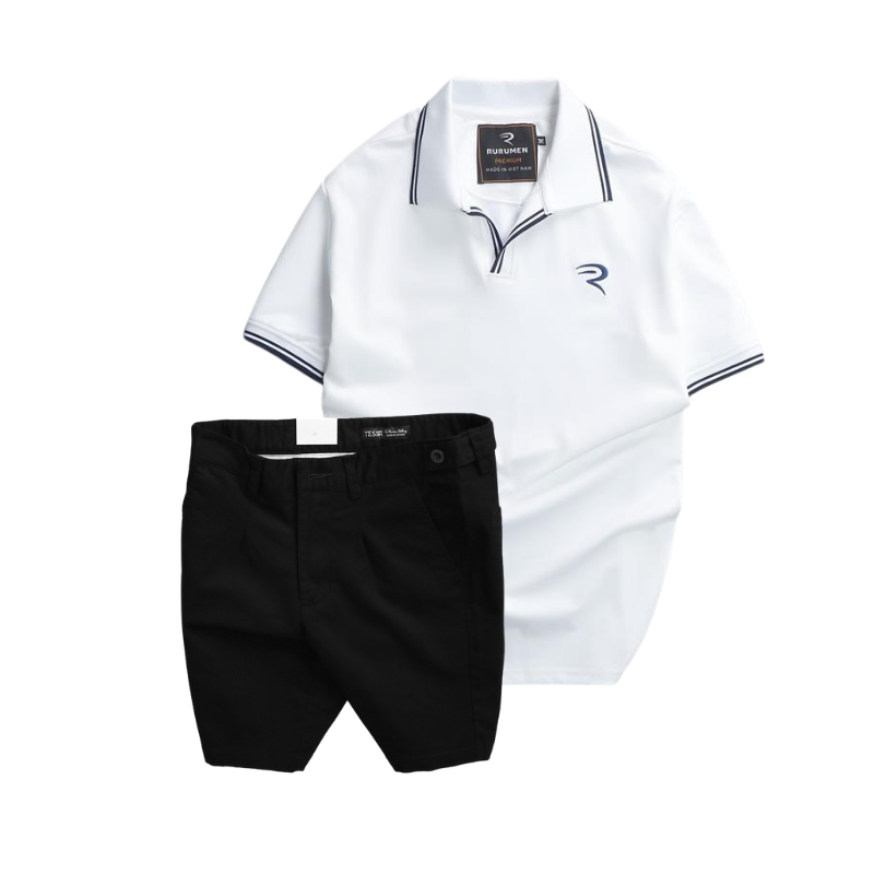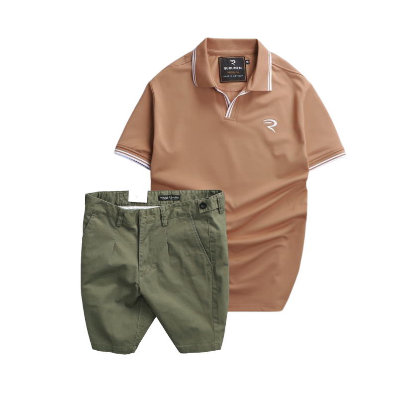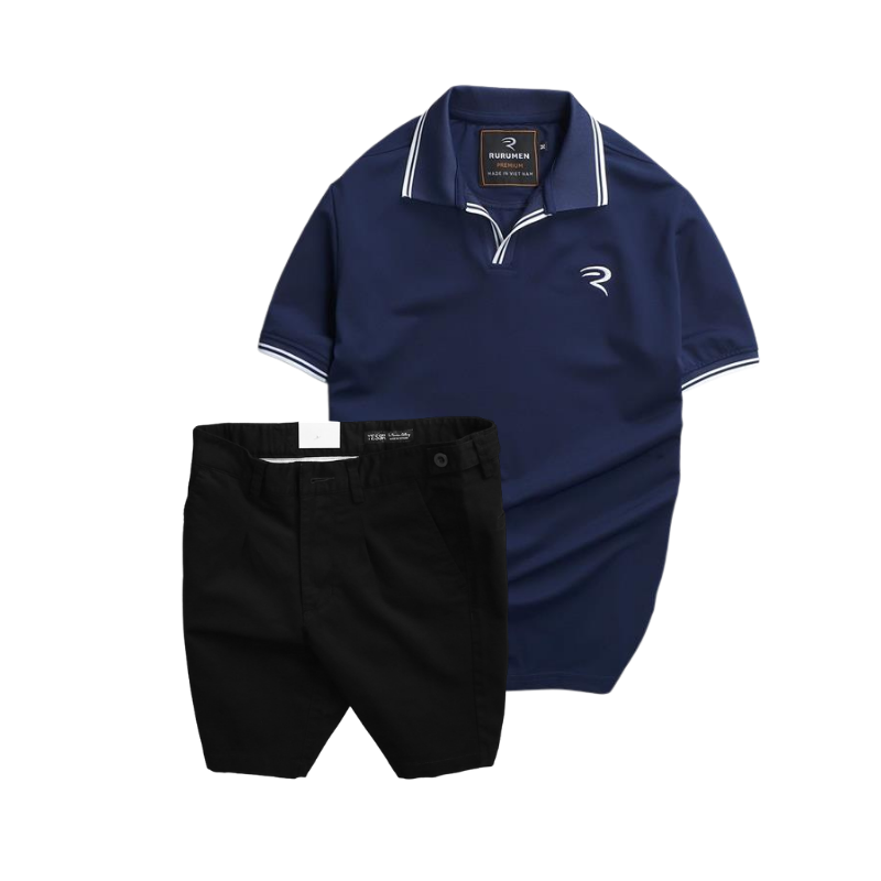 Set Bộ Nam – Áo Thun Nam Polo Cổ Bẻ Viền Bo Ngực Thêu Logo Chữ R Và Quần Short Kaki Co Giãn Phối Nút Cao Cấp (Có Size 36)