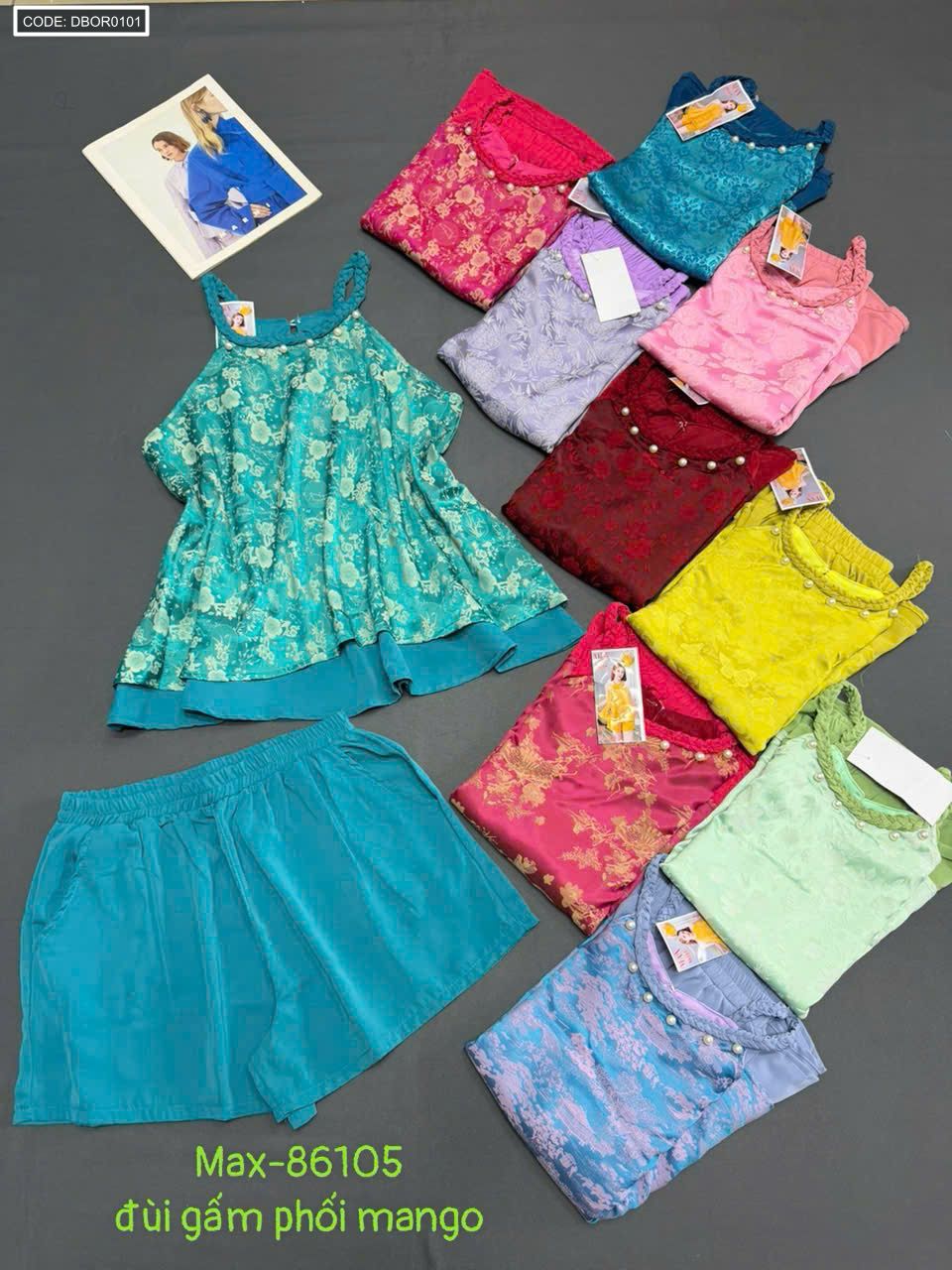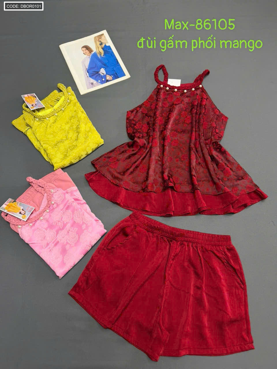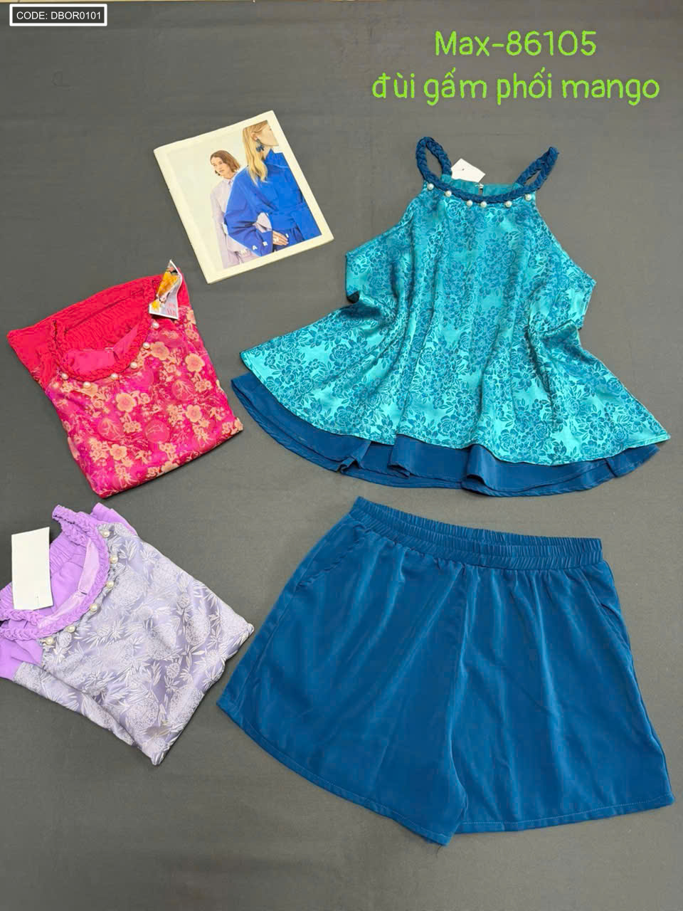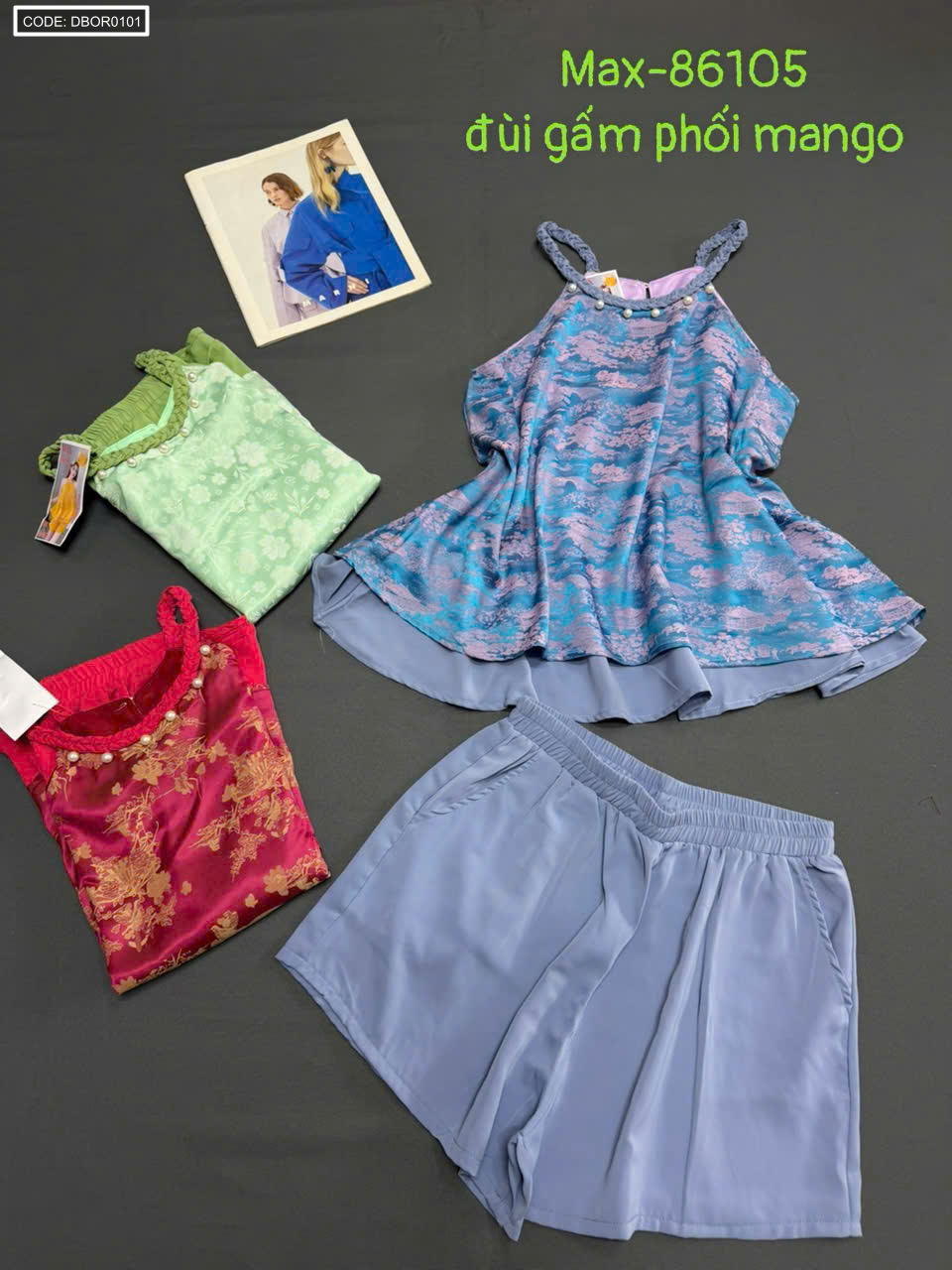 Shop sỉ đồ bộ nữ cổ yếm quần đùi vải gấm phối mango